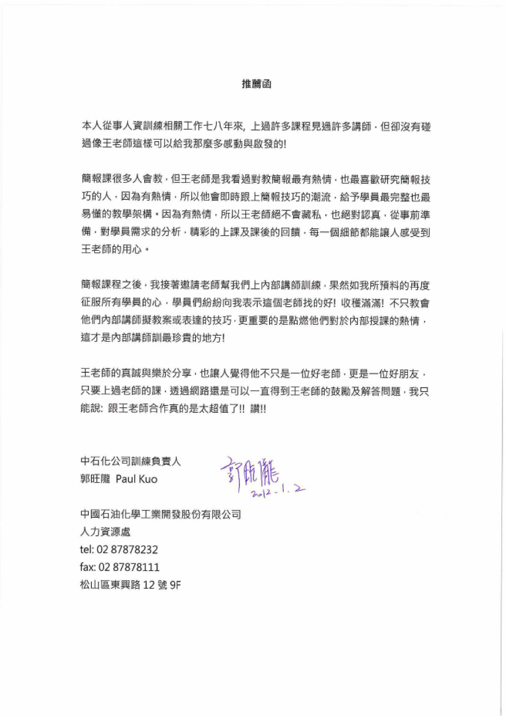 企业训练核心课程: 专业简报力(简报技巧训练)、教学的技术(企业内部讲师训练)