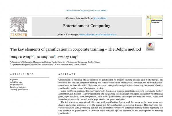 SCI 期刊论文:The key elements of gamification in corporate training – The Delphi method,荣获国外SCI期刊Entertainment Computing 颁发年度最佳论文(2022),中译:「企业教育训练游戏化关键要素——德尔菲法研究」。在刊出三年内(2022~2025)被引用次数突破百次,成为高引用论文。