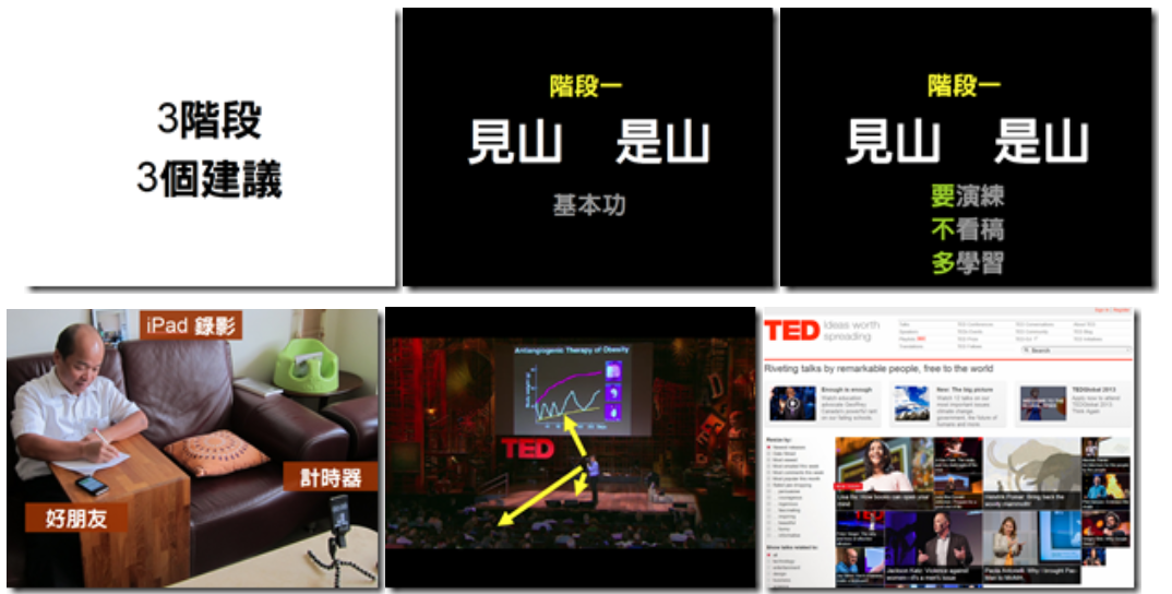 像是刚才的简报修炼三阶段演讲,这三个阶段、三建议都是以高桥流来制作投影片,除了开始时提到三阶段,中间分别说明三阶段及三个建议,在结尾时还再重新把说过的三建议repeat一次……这些都是利用投影片不断强化的做法。