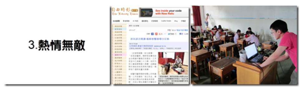 先前的简报技巧演讲,大家印象最深刻的……就是「热情无敌」这几个字吧。整场演讲,最终的核心诉求……就是您有多么热情想跟台下分享?如果有足够的热情,您自然会想办法克服掉所有的问题(谢谢杨斯棓医师的现身说法及示范……王永福还欠一篇反核演讲现场记录的文章啊!)。当初在演讲规划时,也是思考了好久……才浓缩成这一个重点,所有的举例、故事,最后就为了凸显这个重点。最后在参与观众的演讲回馈文章里,也看到大家都有记住了这个重点……这就是一以贯之的威力啊!