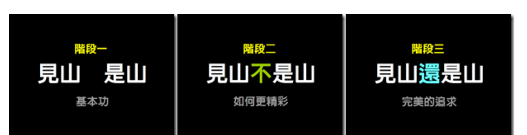 比如说王永福先前在简报技巧演讲时,把演讲内容切成「投影片、实务、准备」三个重点。或是另一场谈到简报修炼的三阶段「见山是山/不是山/又是山」,每阶段又各自提出三个建议……这些都是三个重点的应用。